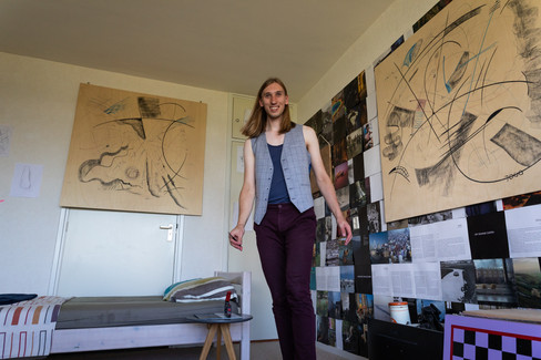 In zijn appartement op een van de hoogste verdiepingen in een flatgebouw in Leeuwarden merk je meteen hoe veel aandacht Jurre besteedt aan details en vormgeving. Een aantal meubelstukken heeft hij zelf ontworpen en gemaakt tijdens zijn studie. Hij verzamelt kunstboeken en kunstwerken, maar legt zichzelf daarbij wel bepaalde regels op. In zijn kunstcollectie mag hij bijvoorbeeld niet meer dan 10 werken hebben. Daardoor krijgt zijn zoek- en aankoopproces van nieuwe kunstwerken nog meer aandacht en meer waarde.